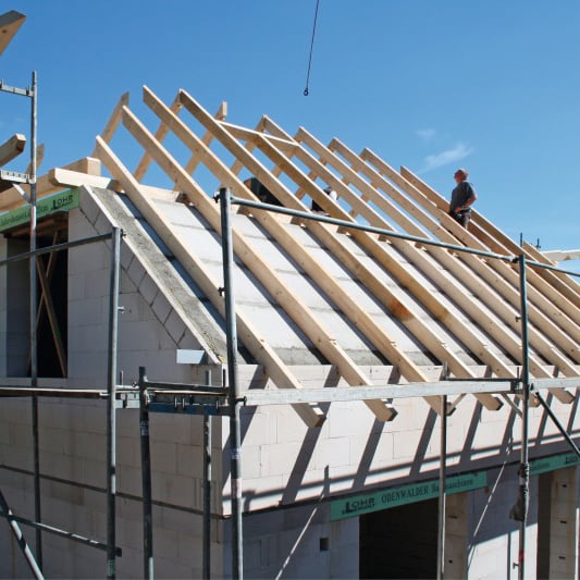 Nun werden die Innenwände angelegt. Hierfür verwenden wir Ytong- Steine mit einer hohen Dichte, um Speichermasse für ein gutes Wohnklima und einen hohen Schallschutz zu gewährleisten.