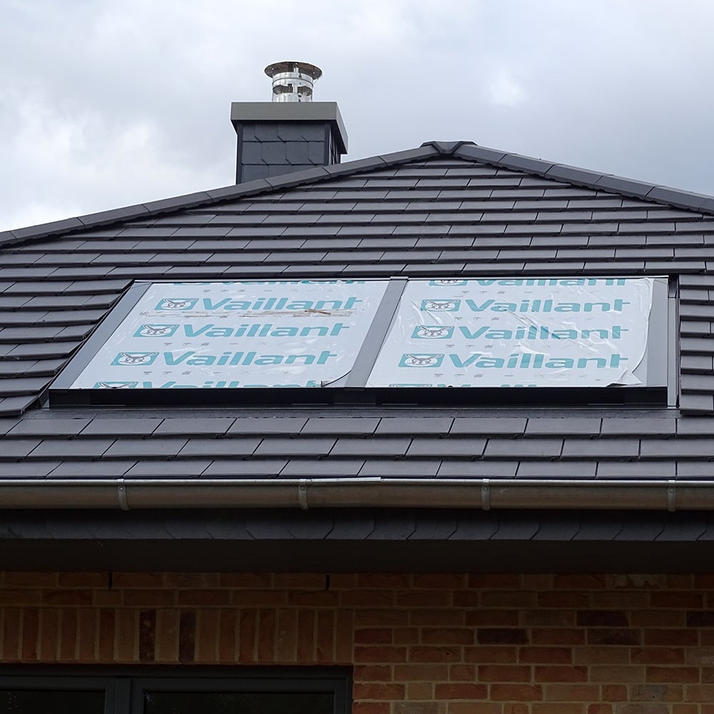 Die Dacharbeiten sind nahezu abgeschlossen (28.07.2020). E fehlen noch die als Innen-Dach-Montage geplanten Vaillant-Solarkollektoren. Aufgrund der Coronakrise konnten die in Italien produzierten Aluträger leider erst sieben Wochen später geliefert werden.